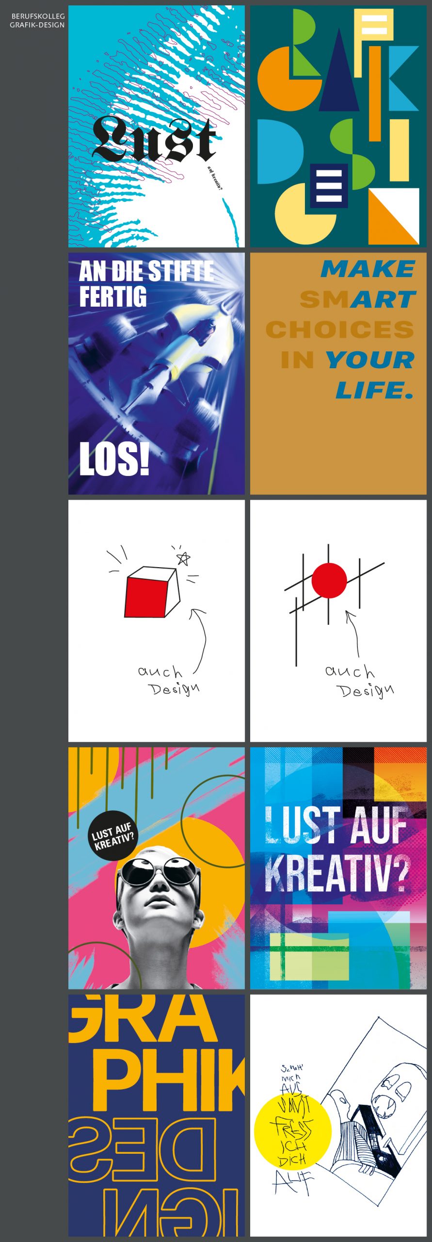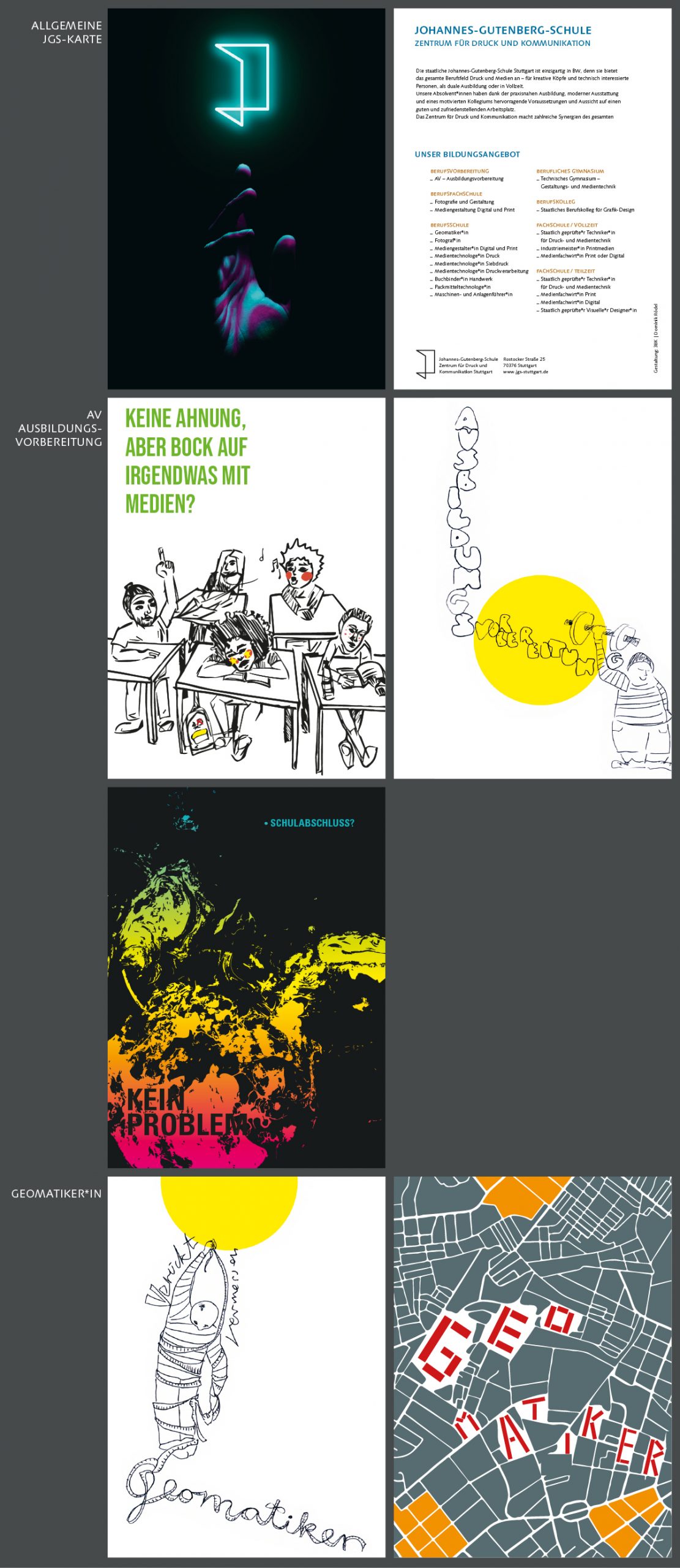 Während die künftigen Schüler*innen an der Aufnahmeprüfung für das Berufskolleg Grafik-Design teilnahmen, gestalteten die Schüler*innen des 2. Ausbildungsjahres DIN A5 Postkarten für die angebotenen Bildungsgänge der JGS.