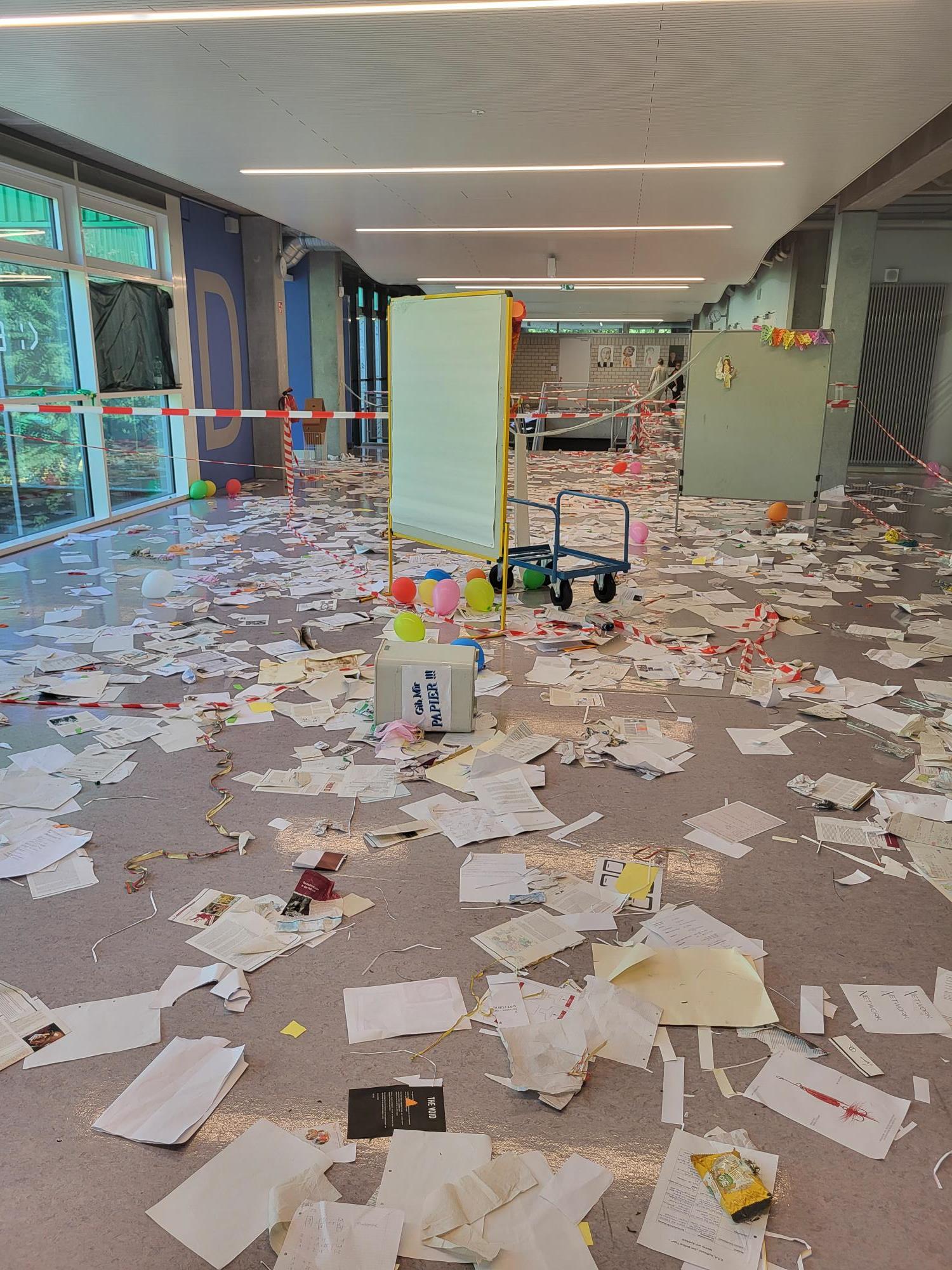 Am 16. Juni traf sich der Jahrgang um 7 Uhr und versperrte mit Luftballons, Baustellenbändern, Stellwänden und Unmengen an Altpapier aus entsorgten Unterrichtsmitschriften und Arbeitsblättern den Zugang zum Bereich des Beruflichen Gymnasiums. Der Schulleiter war informiert und so war der Rahmen auch nicht auf die gesamte Schule ausgedehnt, denn in den übrigen Schularten wird noch weiter auf andere Abschlüsse hingearbeitet. Es gab Musik und mit einer Polonaise wurden die Klassen aus dem Technischen Gymnasium und auch aus dem VABO (Vorbereitung Arbeit- und Beruf ohne Deutschkenntnisse für Geflüchtete aus der Ukraine) samt ihrer Lehrer:innen aus den Klassenzimmern geholt. Auf dem Schulhof wurden dann allerlei Spiele wie Sackhüpfen und Limbo gespielt. Beim Lehrerquiz gewann dann auch noch der Schulleiter Herr Edgar Waldraff. Im Anschluss gab es im Konferenzsaal einen Rave und um 14 Uhr war alles wieder pikobello aufgeräumt.