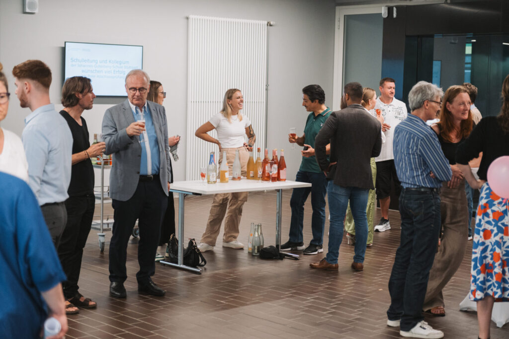 Das Programm des Abends begann nach einem Sektempfang mit einer kurzen Begrüßung, gefolgt von einer musikalischen Darbietung. Anschließend wurde die Abschlusspublikation, der sogenannte Impuls mittels einer Präsentation den Gästen vorgestellt, ehe es in eine Pause ging. Hier konnten sich die Gäste unterhalten, Exemplare der Abschlusspublikation Impuls ansehen und an dem breiten Buffet, das mit Snacks und kleinen Häppchen gefüllt war, bedienen. Dieses wurde durch das Kantinenteam der Johannes-Gutenberg-Schule zu- und vorbereitet.