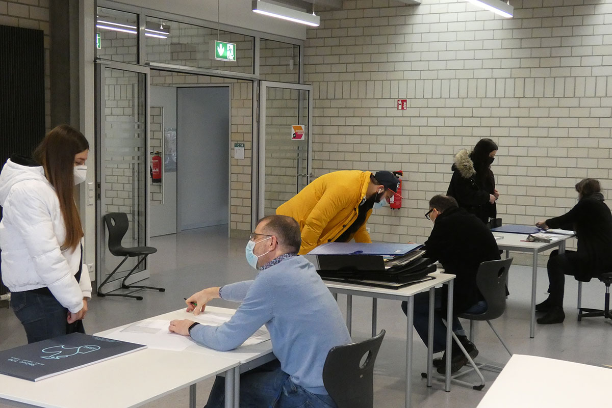 An der Aufnahmeprüfung für das Berufskolleg Grafik-Design an der JGS haben zahlreiche Bewerberinnen und Bewerber teilgenommen. Die Prüfung fand am 15. und 16. März statt. Unsere Bilder zeigen einige Bewerberinnen und Bewerber bei der Abgabe der Mappen, die am Dienstag von Abteilungsleiter Thomas Dulisch und den 3BK-Fachlehrern Maria Mock und Maurizio di Dario entgegengenommen wurden kurz vor Beginn der gestalterischen Prüfung.