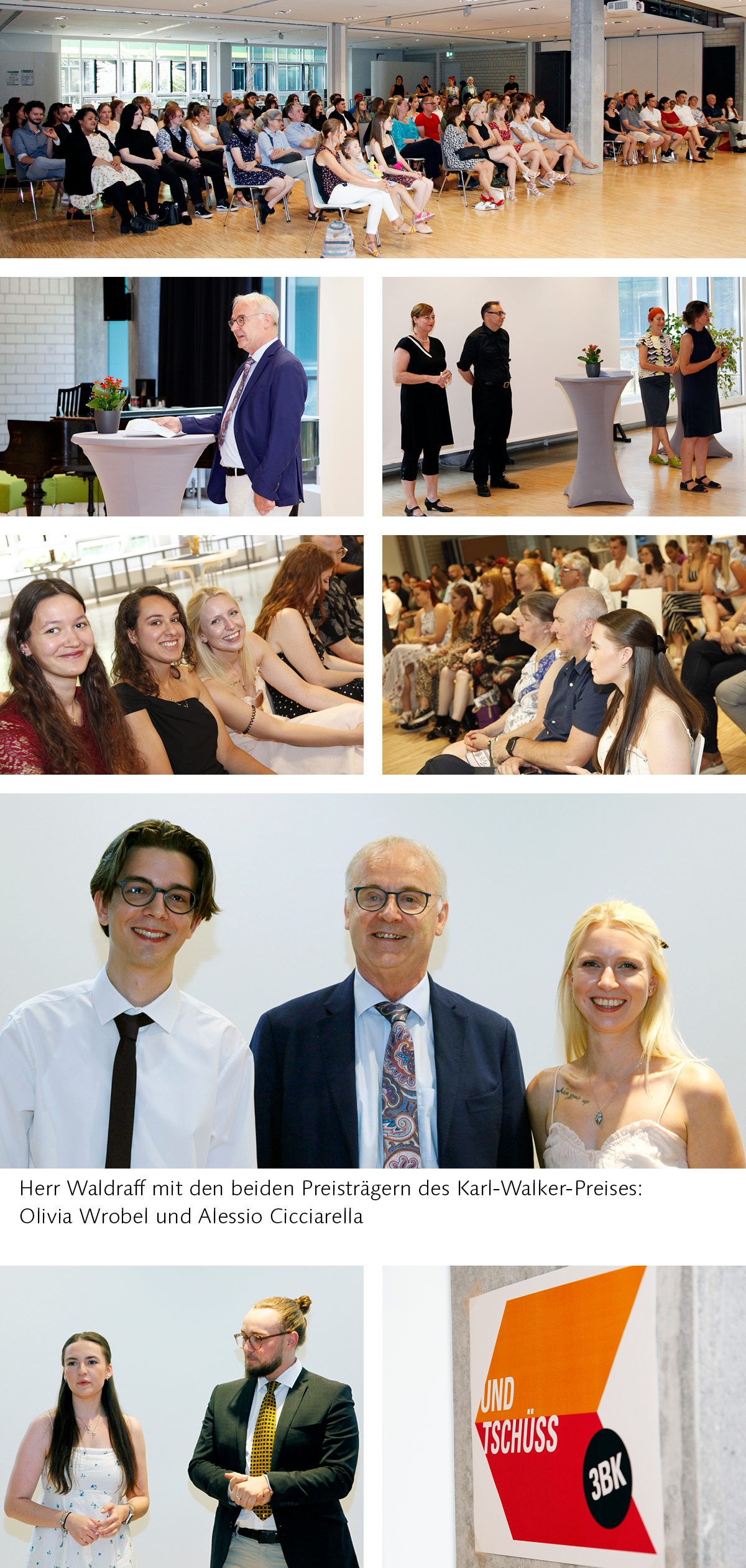 Nun ging es an die feierliche Übergabe der Abschlusszeugnisse an die 42 Absolventen:innnen, dabei erhielten die Schüler:innen ein gezeichnetes Selbstportrait oder einen Zukunftsbrief aus dem ersten Schuljahr, was zu schmunzelnden Gesichtern und allgemeiner Erheiterung führte. Die Preise der Karl-Walker-Stiftung, welcher die besonderen sozialen und schulischen Leistungen würdigt, gingen in diesem Jahr an Olivia Wrobel (1. Preis) und Alessio Cicciarella (2. Preis).