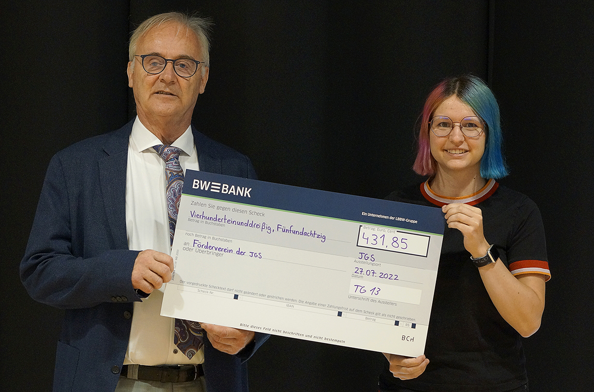 Aus der Jahrgangsstufenkasse der diesjährigen Abiturienten am TG hat Lisa Spiller heute am letzten Schultag dem JGS-Förderverein eine Spende von 431, 85 Euro zukommen lassen: