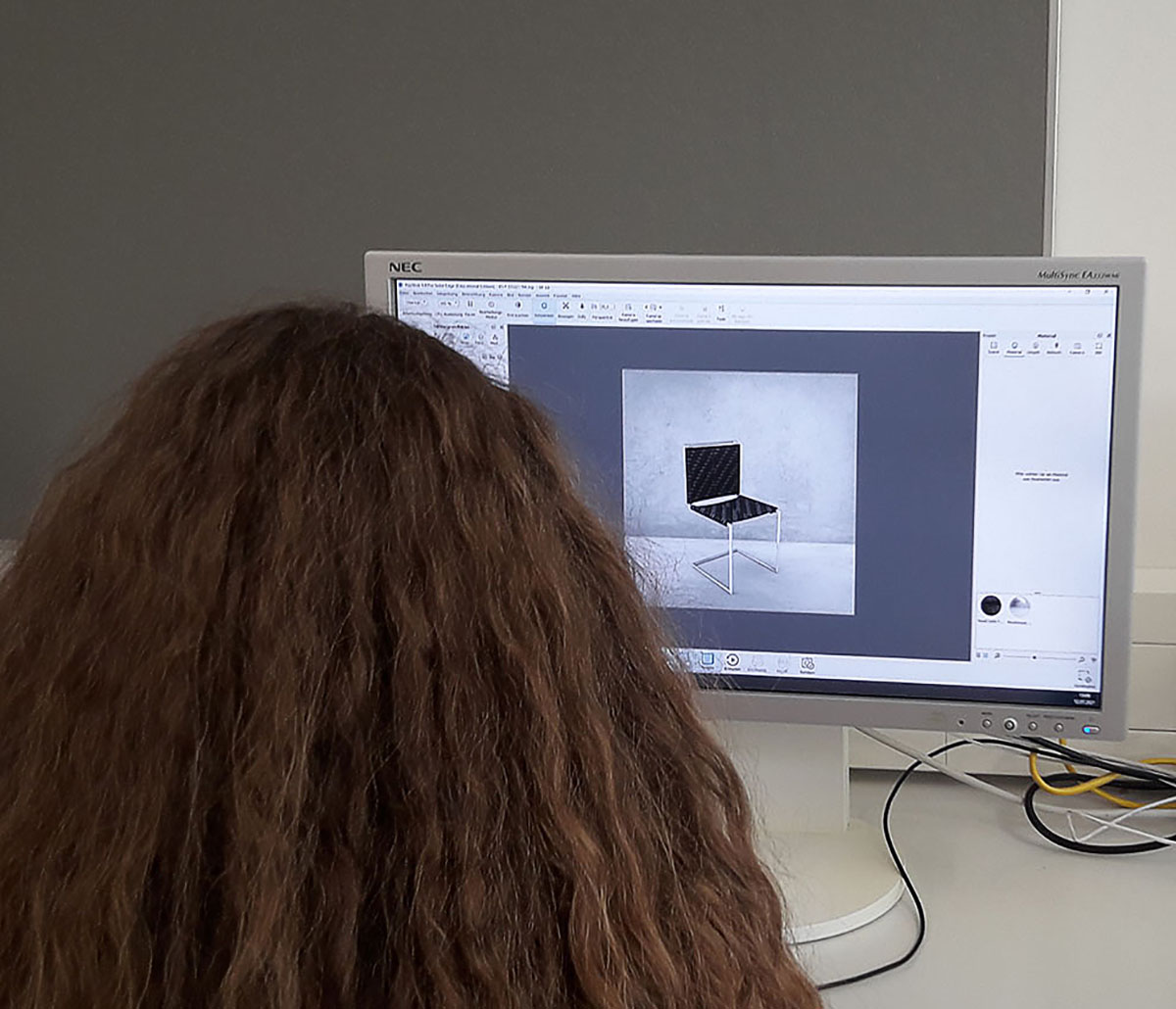 Neben den Kenntnissen im Umgang mit den klassischen Grafik- und Bildbearbeitungsprogrammen wird in der Jahrgangsstufe 1 (12er) computerbasiertes Konstruieren mit dem 2D/3D-CAD-System Solid Edge geschult. Als Einstiegsaufgabe galt es den an der HFG-Ulm von Max Bill entworfene „Ulmer Hocker“ dreidimensional zu konstruieren. Zudem mit passenden Oberflächeneigenschaften, Licht und Schatten zu versehen und mit Fotos aus dem Schulumfeld zu composen. Darauf aufbauend war der am Bauhaus entwickelte Freischwinger von Marcel Breuer zu konstruieren und zu rendern.