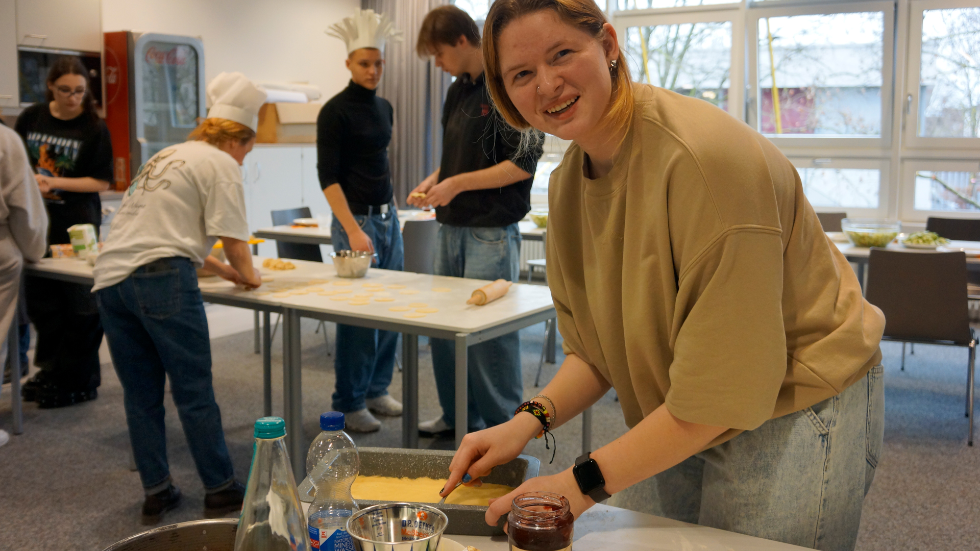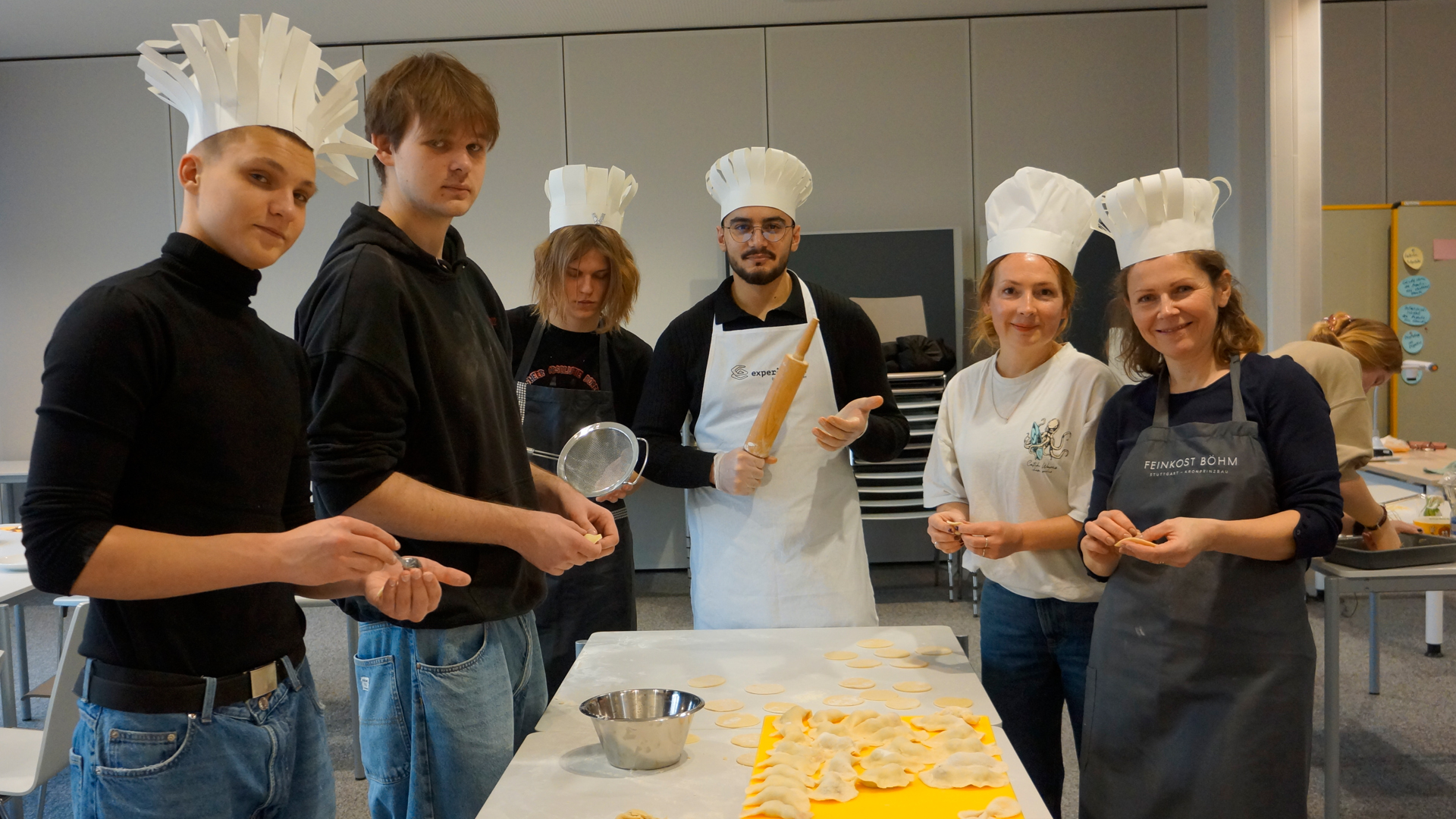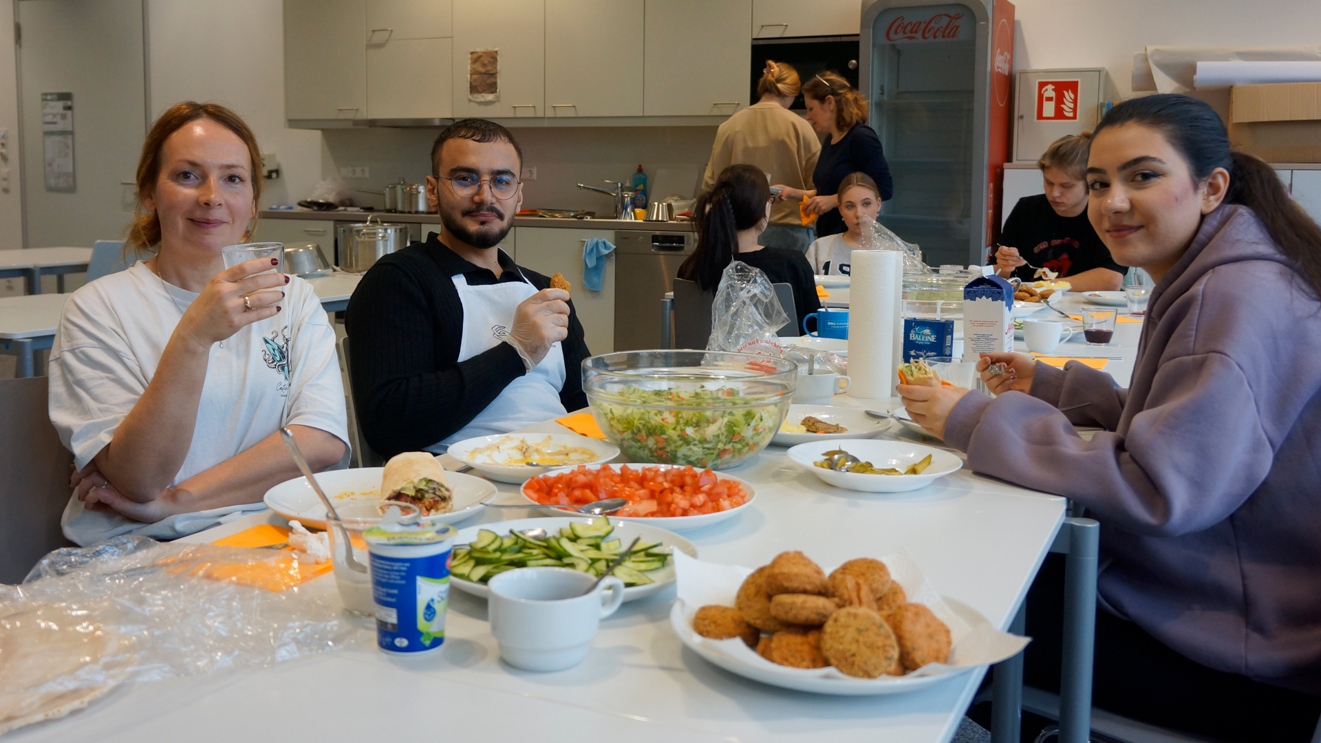 Die Vorbereitung begann mit der Auswahl der Rezepte und dem Zusammenstellen der Zutaten. Jede Gruppe übernahm ein Gericht, lernte neue Kochtechniken und half sich gegenseitig. Während die einen Teig kneteten, schnitten die anderen Gemüse oder rührten duftende Saucen an. In der Küche herrschte eine tolle Atmosphäre voller Teamgeist und Freude am Kochen. In kleinen Gruppen kochten wir unter anderem knusprige Falafel mit Joghurt-Sesam-Sauce, süße Vareniki mit Kirschen und das orientalische Dessert Kunafa.