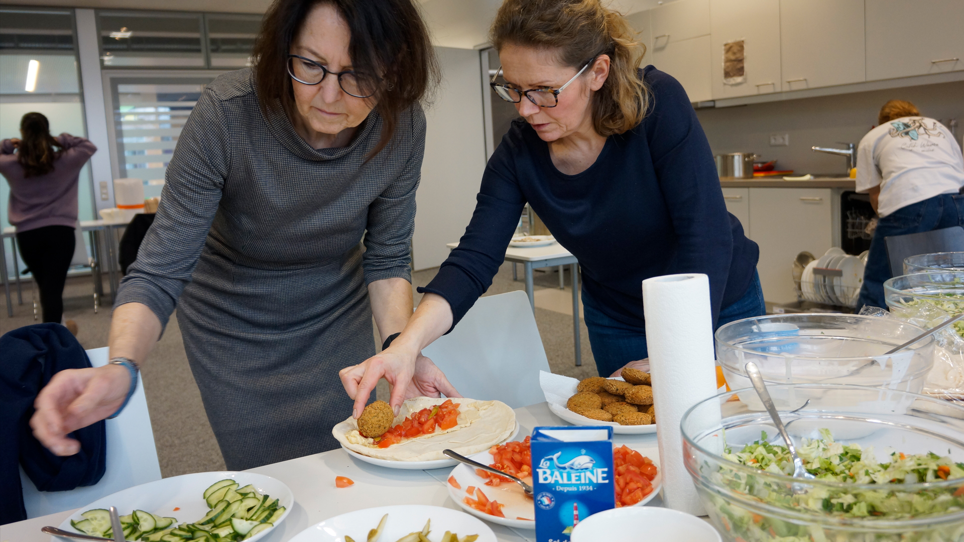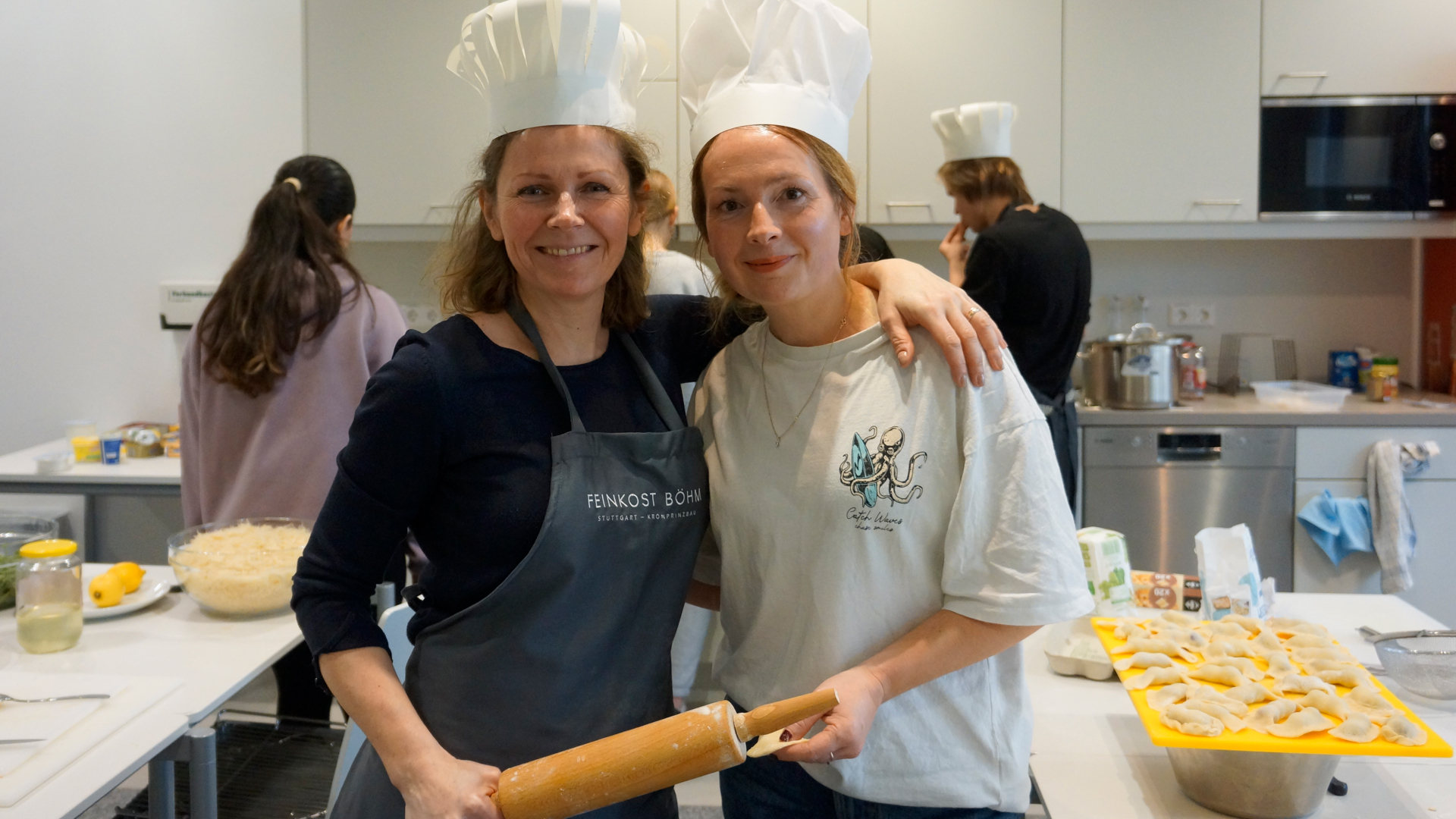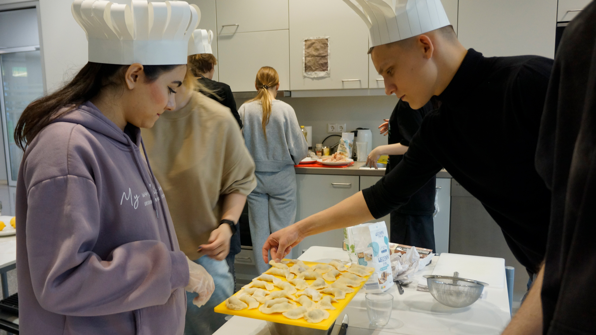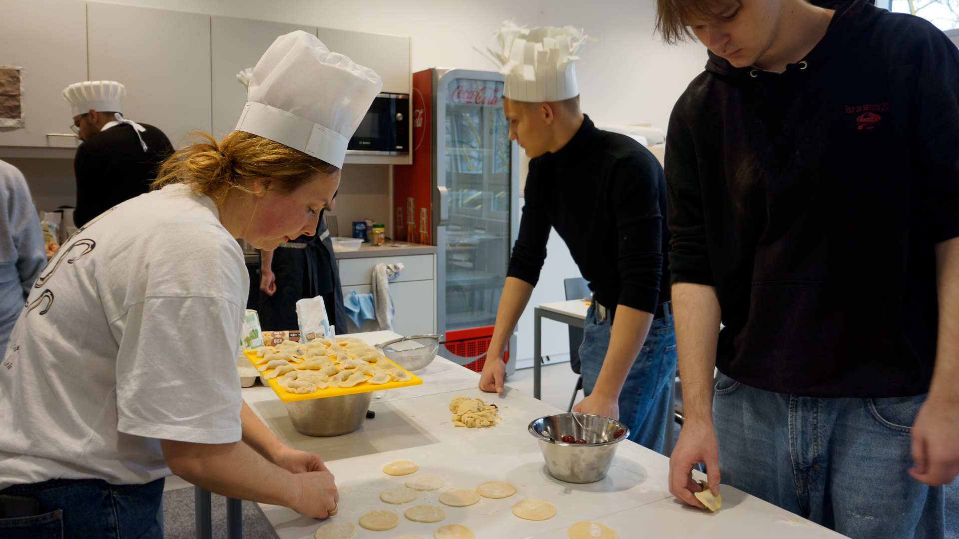 Die Vorbereitung begann mit der Auswahl der Rezepte und dem Zusammenstellen der Zutaten. Jede Gruppe übernahm ein Gericht, lernte neue Kochtechniken und half sich gegenseitig. Während die einen Teig kneteten, schnitten die anderen Gemüse oder rührten duftende Saucen an. In der Küche herrschte eine tolle Atmosphäre voller Teamgeist und Freude am Kochen. In kleinen Gruppen kochten wir unter anderem knusprige Falafel mit Joghurt-Sesam-Sauce, süße Vareniki mit Kirschen und das orientalische Dessert Kunafa.