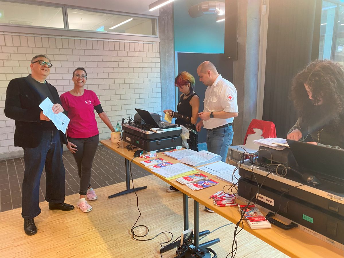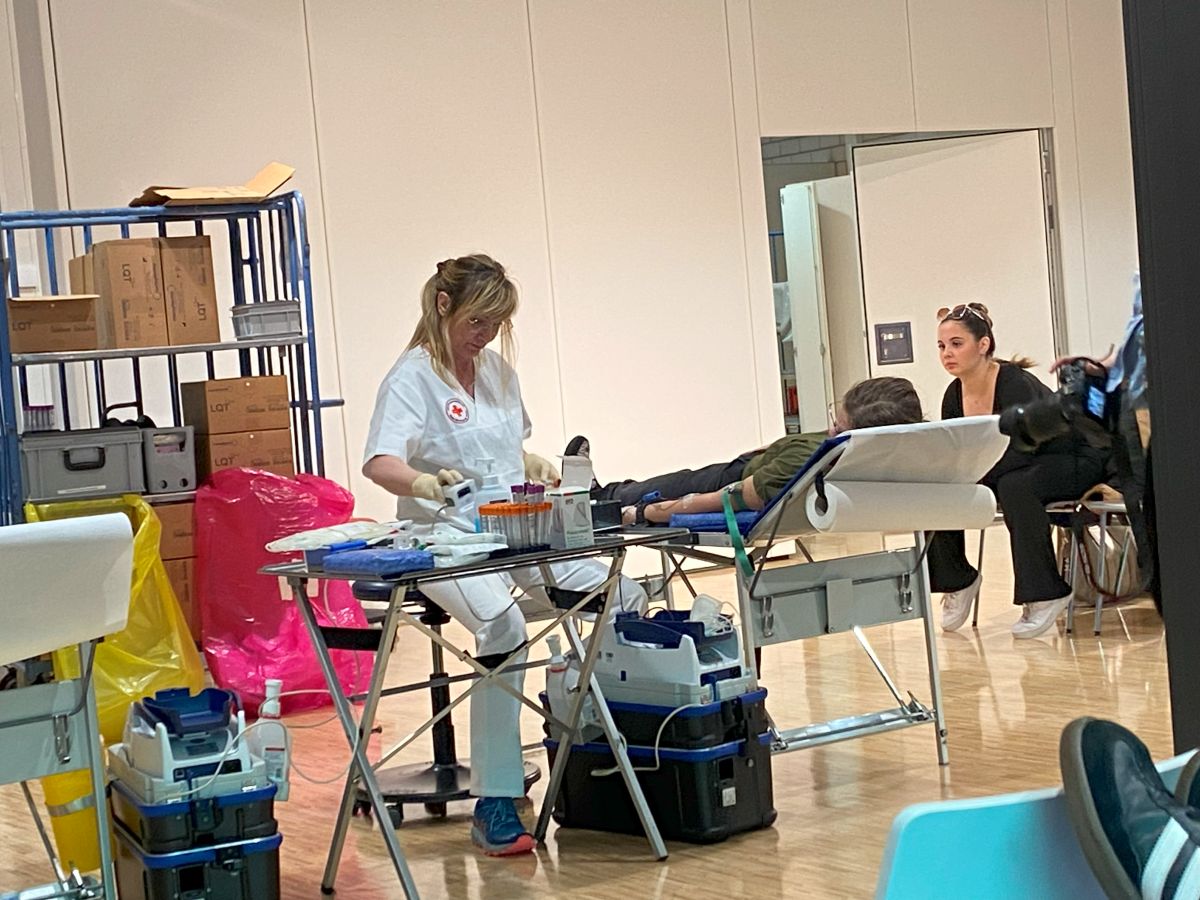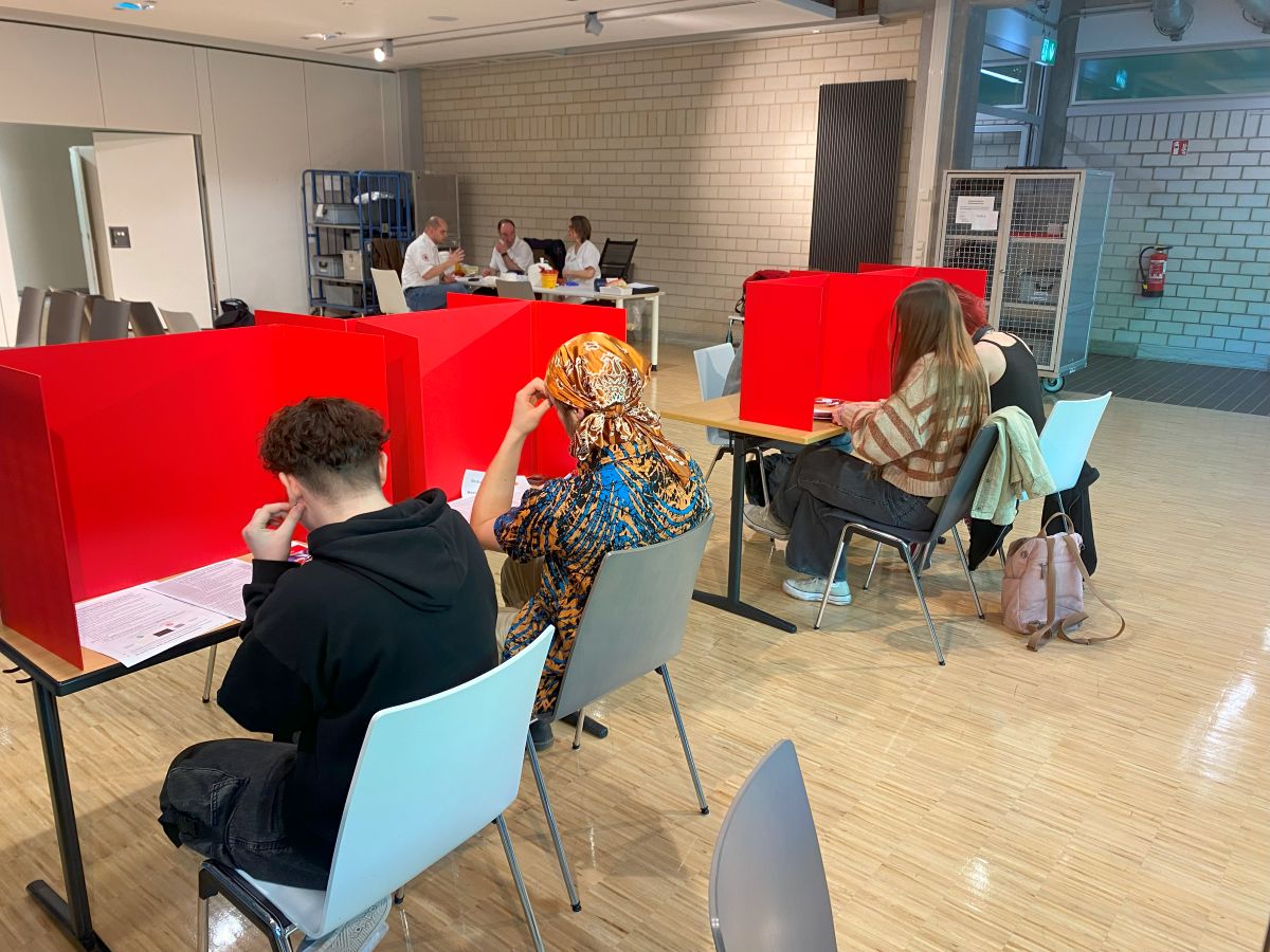 Die Aula der Schule bekam an diesem Morgen innerhalb von einer halben Stunde einen ganz anderen Charakter. Der sonst so leere Raum war plötzlich von einer unglaublichen Bertriebsamkeit erfüllt. Lenya und Mailin aus der TG 12 haben nach ihrer Onlineschulung die Daten der Spender sehr professionell erfasst. Nach dem Ausfüllen eines umfangreichen Fragebogens ging es dann zur Blutgruppenbestimmung, Hämoglobinwert ermitteln, Blutdruck usw. Anschließend entschieden die Ärzte ob eine Spende erwünscht ist. 38 von 46 erschienen Spendern durften ihr Blut abgeben.