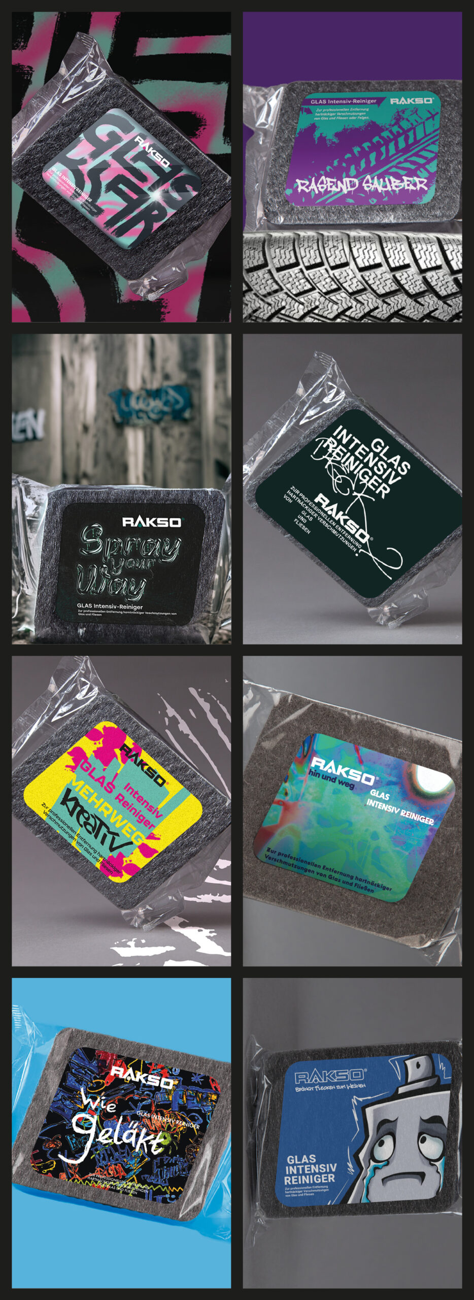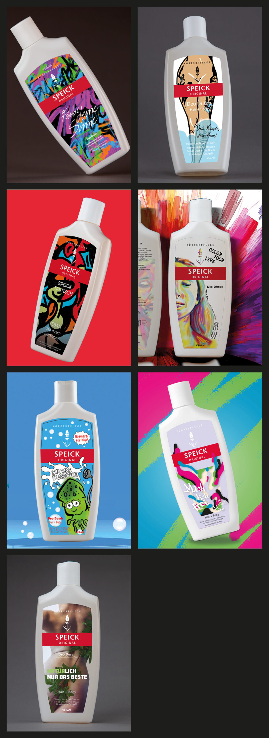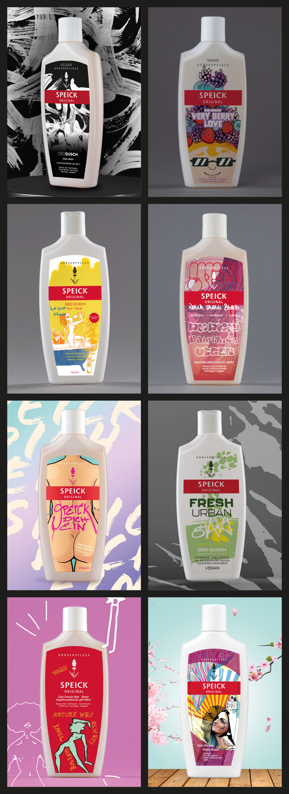 In Kooperation mit fs-Etiketten aus Friesenheim entwarfen die 2. Klassen des Berufskolleg Grafik-Design im vergangenen Schuljahr unter dem Dachthema »Streetart« Etiketten für die Produkte Speick Deo Dusch und Rakso Glasreiniger.