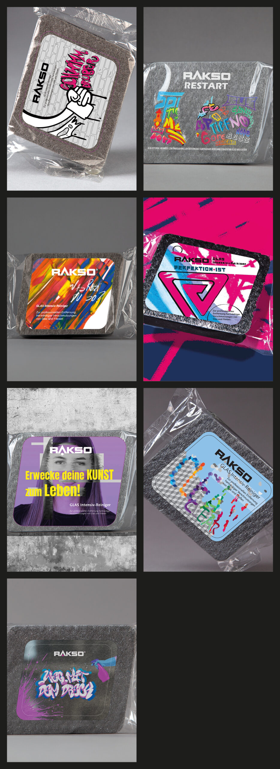 In Kooperation mit fs-Etiketten aus Friesenheim entwarfen die 2. Klassen des Berufskolleg Grafik-Design im vergangenen Schuljahr unter dem Dachthema »Streetart« Etiketten für die Produkte Speick Deo Dusch und Rakso Glasreiniger.