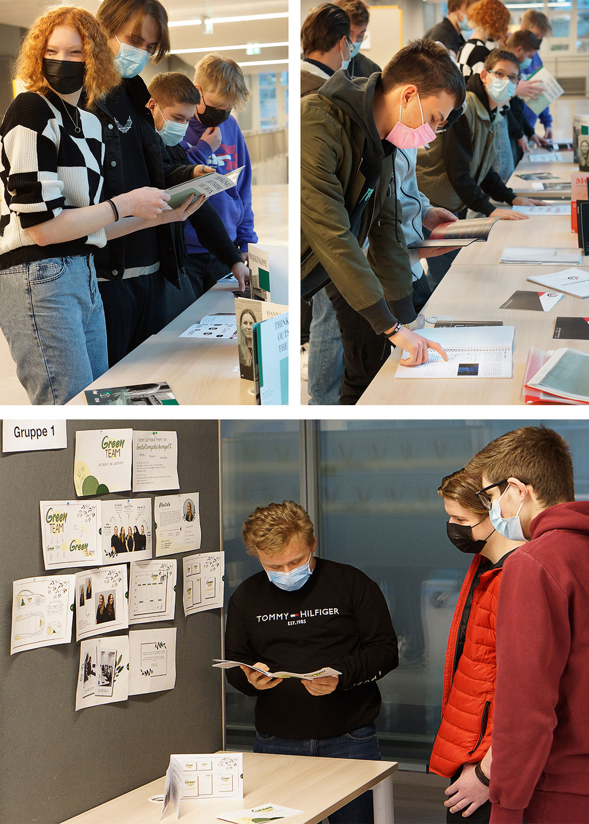 Die Mediengestalterklassen haben sich mit dem Thema Bewerbung auseinandergesetzt und sich in Form einer Imagebroschüre fiktiv vorgestellt. Die Geomatikerklasse hatte eine geografische Karte konzipiert und realisiert.