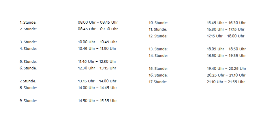 Nachmittags wird der Unterricht zu drei oder zwei Stunden zusammengefasst, wobei es Freistunden gibt. Späten Nachmittags- und Abendunterricht haben in der Regel die Schüler der Meister- und Technikerschule und die Berufsschüler, die den Zusatzunterrricht zur Erlangung der Fachhochschulreife besuchen.