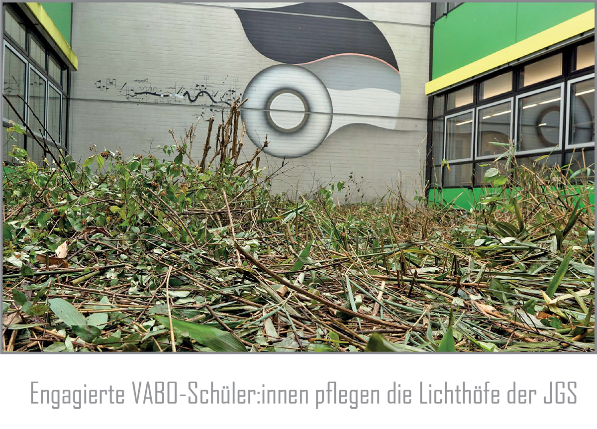 Durch die Jahre hindurch hatte sich ein Lichthof zu einem undurchdringlichen Dickicht aus Bambuspflanzen entwickelt. Die grüne Pracht, die einst vielleicht als Dekoration gedacht war, hatte mittlerweile den gesamten Raum erobert und drohte, das einstige Atrium zu verschlingen. Die Johannes-Gutenberg-Schule entschied sich, diesem grünen Dschungel entgegenzutreten, und zwei VABO-Klassen übernahmen die Verantwortung für die Pflege und Wiederherstellung dieses kleinen, von Natur umgebenen Rückzugsorts.