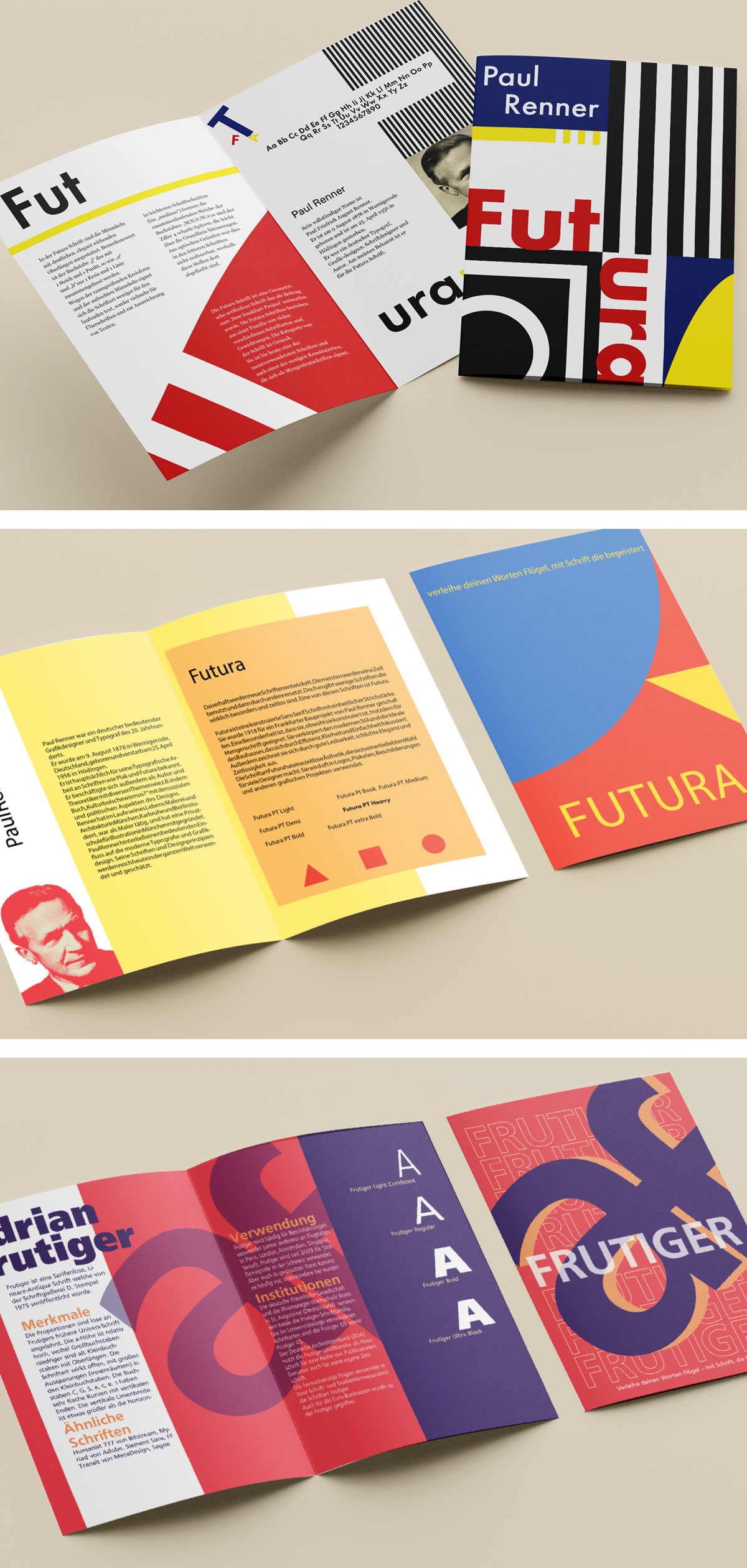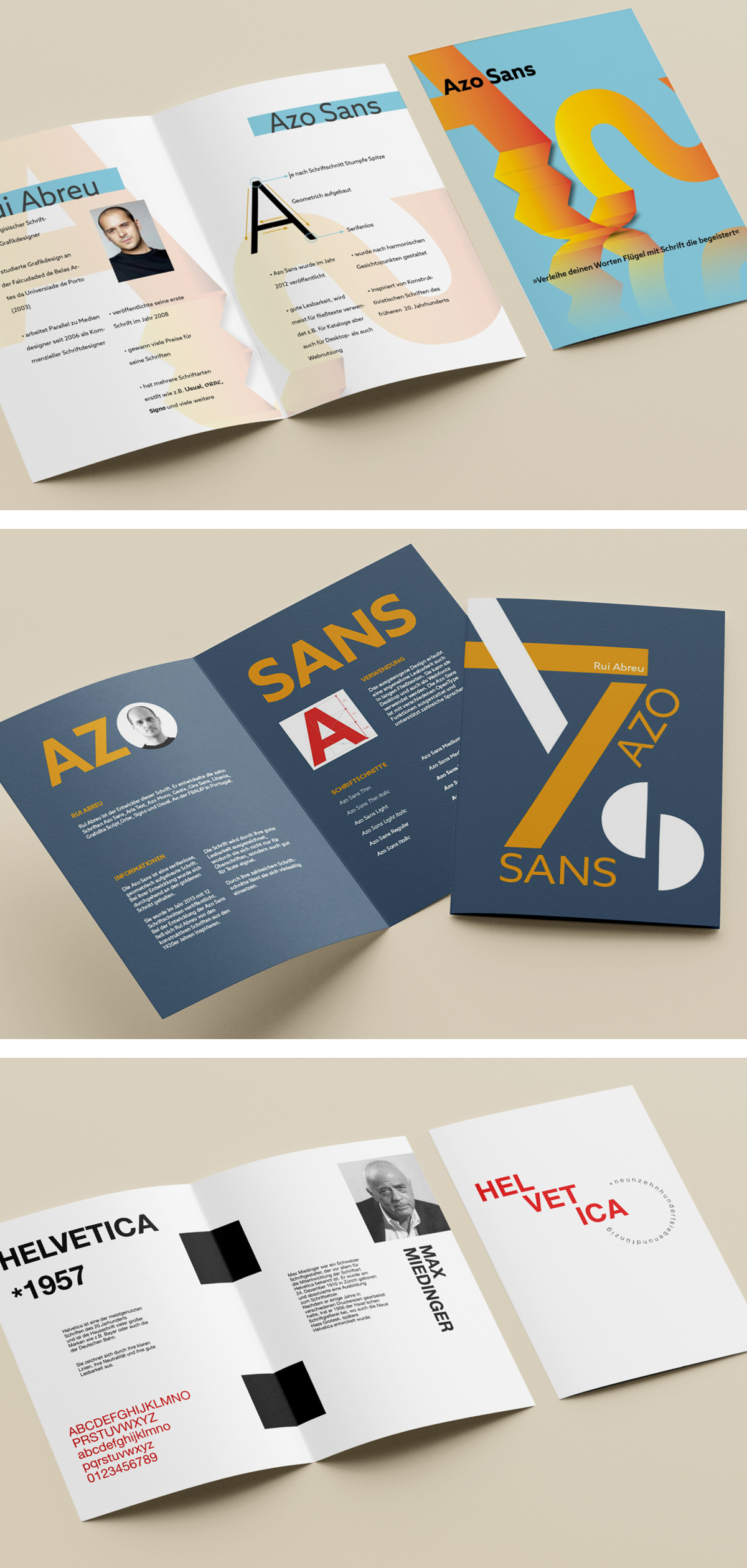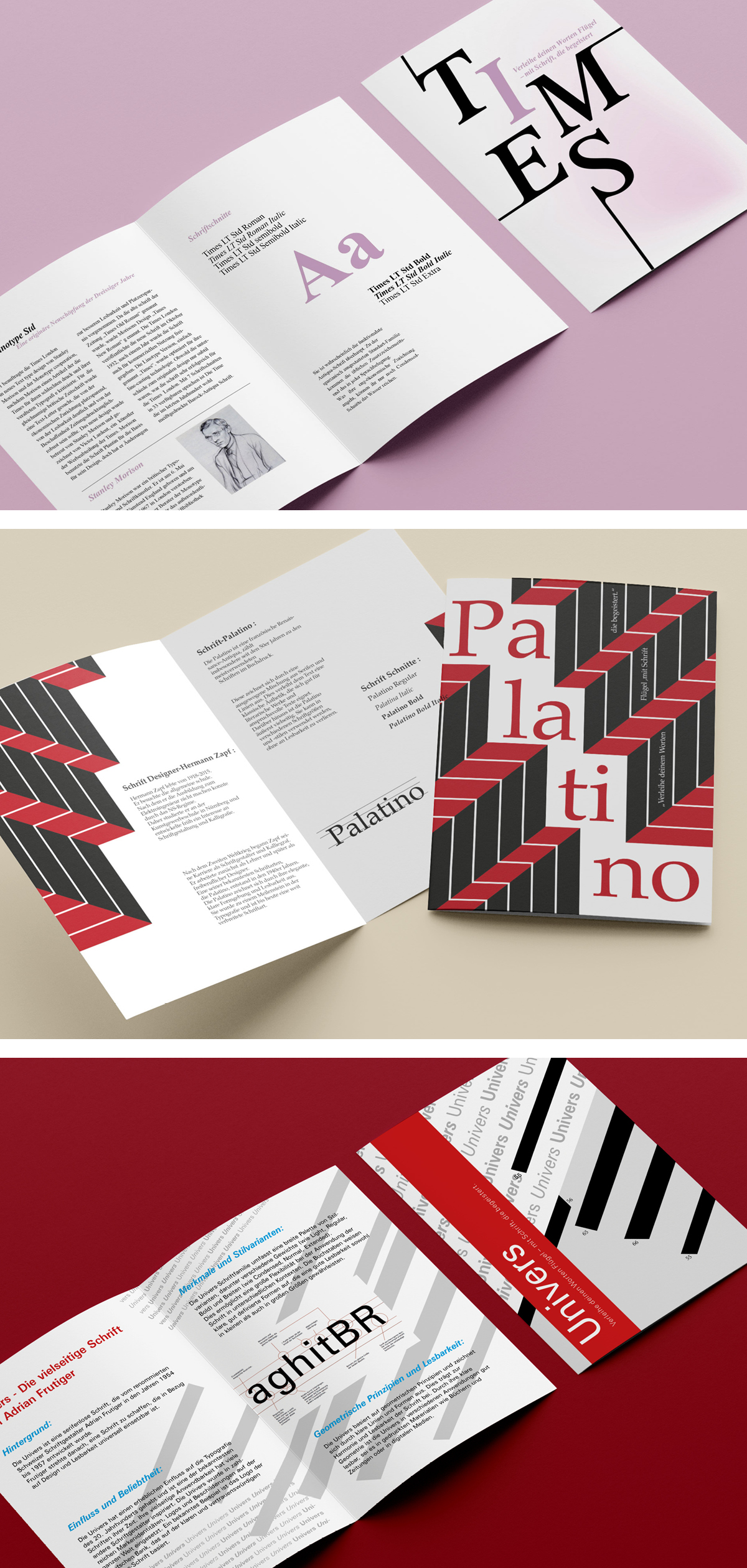 Die Schüler:innen starteten die Umsetzung dieser praxisorientierten Übungsaufgabe im Fach Typografie gegen Ende ihres ersten Schuljahres. Individuell arbeiteten sie an der Konzeption einer Klappkarte im DIN A5-Format. Die Karte umfasste eine typografisch ansprechende Vorderseite, zwei informative Innenseiten und eine Rückseite, die passend zum Cover gestaltet wurde.