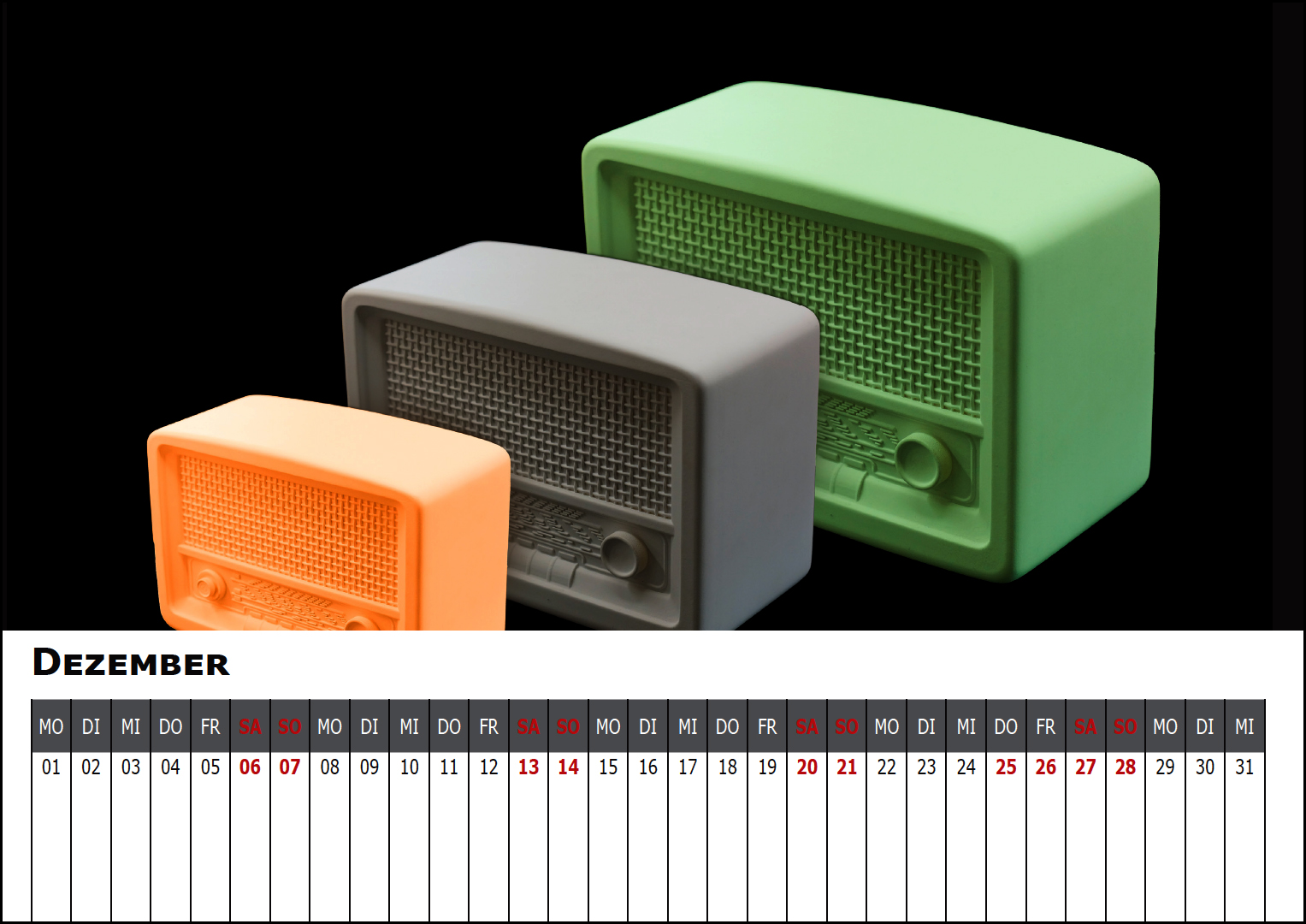 Der Kalender besteht aus 12 Monatsblättern mit einem funktionalen Kalendarium, einem gestalteten Titelblatt sowie einer Rückseite mit Impressum und einer Übersicht aller Monatsblätter. Zusammengehalten werden die Seiten durch eine stabile Metallspiralbindung.