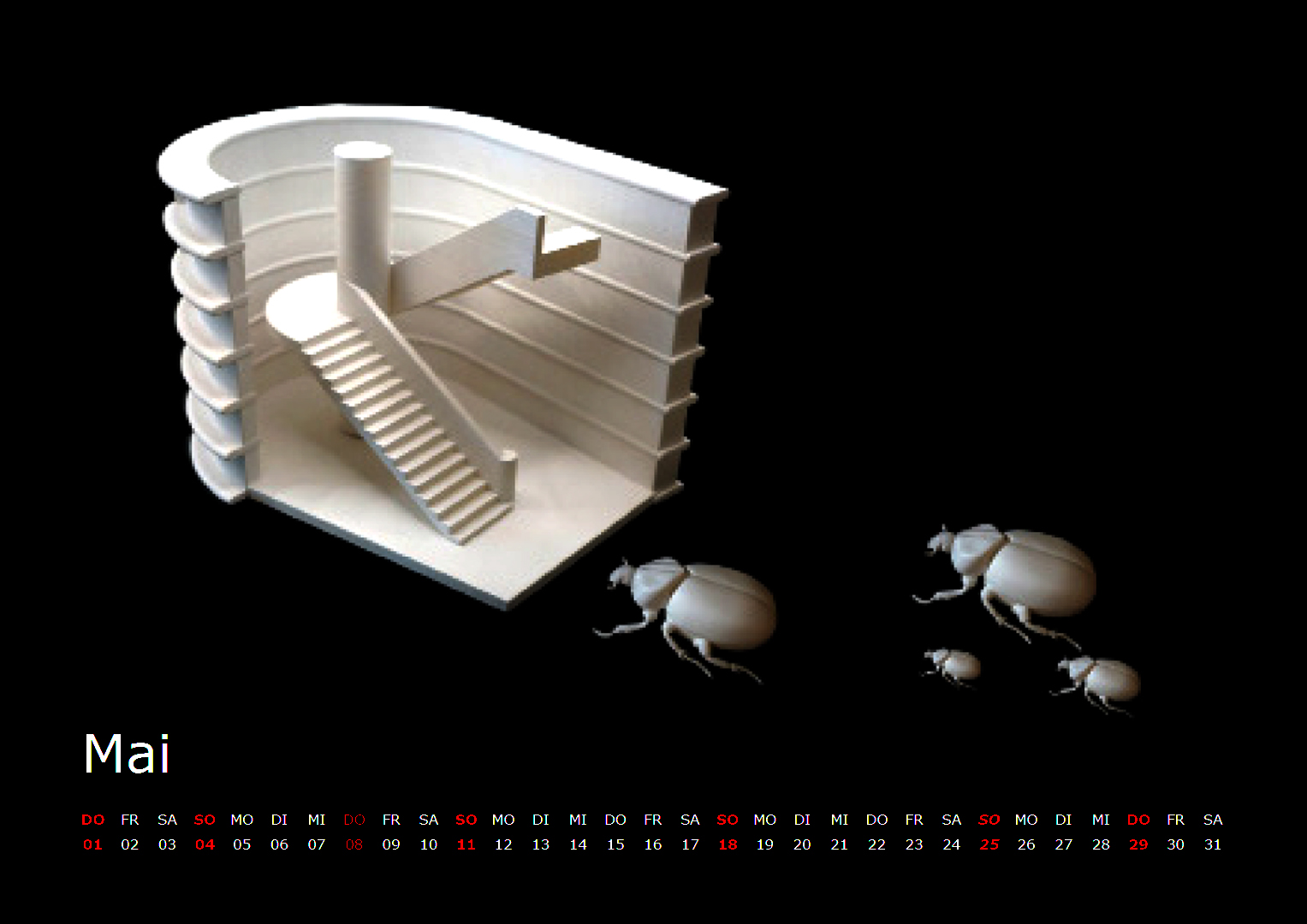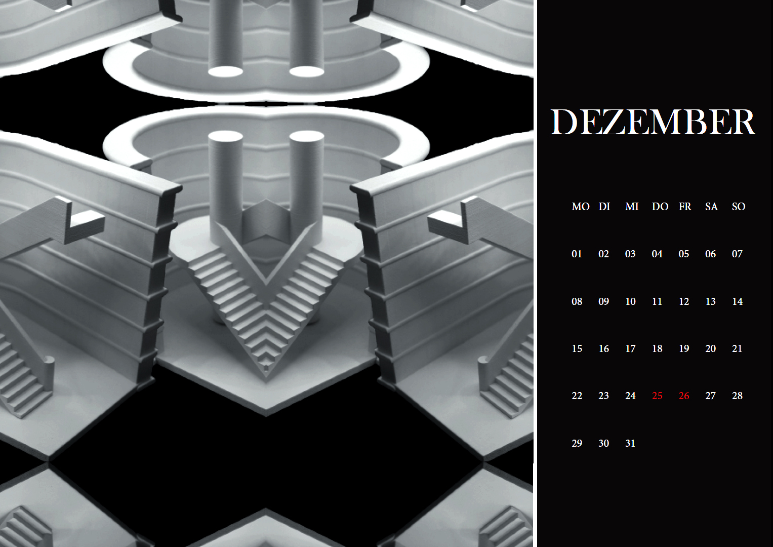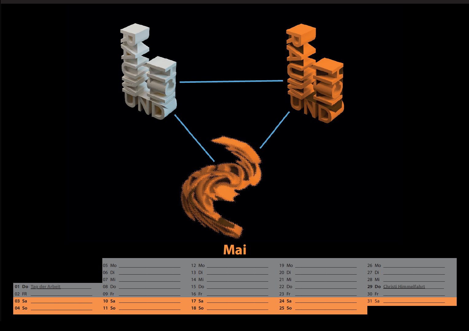 Jeder dieser einzigartigen 3D-Drucke bildet die Grundlage für ein Monatsblatt des Kalenders. Ausgangspunkt der Gestaltung waren Fotografien, die kreativ bearbeitet wurden. Die Motive konnten freigestellt, farblich angepasst, kombiniert, verfremdet oder auf andere Weise modifiziert werden – stets abgestimmt auf das jeweilige Bildkonzept. Entscheidend war, dass das Bildkonzept über alle Kalenderblätter hinweg einheitlich bleibt, um einen harmonischen Gesamteindruck zu schaffen.