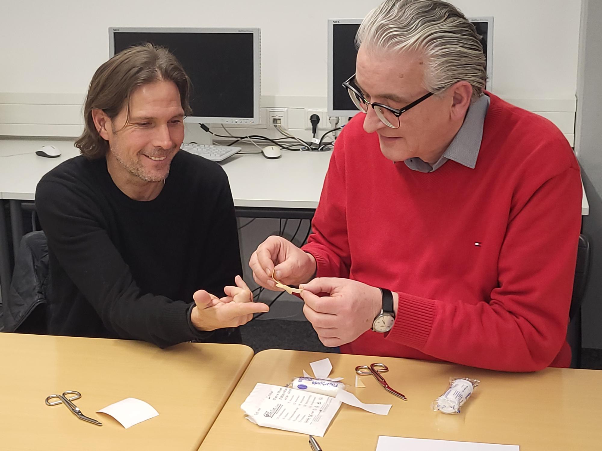 Zwei Mitarbeiter vom Malteser Hilfsdienst im freiwilligen sozialen Jahr teilten ihre Expertise in einem Erste-Hilfe-Lehrgang. Selbst altgediente Absolventen solcher Lehrgänge konnten nicht nur ihre Kenntnisse auffrischen, sondern erfuhren auch neue Handlungsregeln. Nach der Maxime „Treat first what kills first“ („Behandle zuerst, was als Erstes tötet“) ist z.B. zunächst zu überprüfen, ob ein am Boden liegender Patient bei Bewusstsein ist und ob er atmet. Für den Fall, dass dem nicht so ist, lernten die JGS-Lehrkräfte, wie die folgenden Schritte Herzdruckmassage und Beatmung richtig erfolgen. Dazu boten die Mitarbeiter der Malteser in den Räumlichkeiten der JGS ebenso viele praktische Übungen, wie zum Umgang mit einem Defibrillator, zur Seitenlage oder zum korrekten Anlegen von Verbänden.